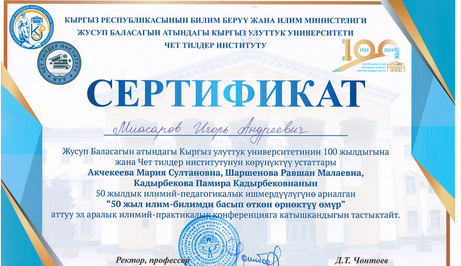 On April 25, 2025, Igor Miyasarov, a lecturer at the International University of Central Asia, delivered a presentation at a scientific conference marking the 100th anniversary of Zh. Balasagyn Kyrgyz National University.